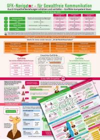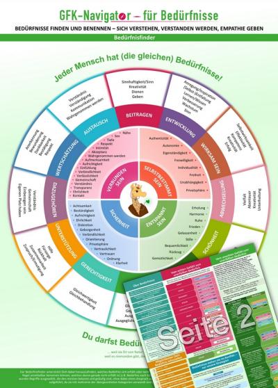 Die VorderseiteEine Übersicht über Bedürfnisse, die alle Menschen, vielleicht sogar alle lebenden Wesen, teilen: Austausch, Entwicklung, Balance, Schönheit, Untersützung, Wertschätzung sind nur einige davon. Zu jedem dieser Grundbedürfnisse gibt es auch noch Verfeinerungen: Wertschätzung kann z.B. durch Anerkennung, Bewunderung, Dankbarkeit, Bestätigung oder Respekt ausgedrückt werden. Ein heilsamer Effekt dürfte schon zu erwarten sein, wenn man die Übersicht mit ihren Begriffen auf der Vorderseite dieses Bedürfnis-Navigators auf sich wirken lässt! Die RückseiteWie hängen Bedürfnisse und Gefühle zusammen? Und noch wichtiger: Wie kommuniziere ich meine Bedürfnisse intelligent, sodass sie nicht nur angehört, sondern auch erfüllt werden können? Im Alltag ist ja genau das oft die Schwierigkeit! Übersichten erleichtern es, das Problem in der Kommunikation der Bedürfnisse zu erkennen und die Mechanismen dahinter zu verstehen: * Über Bedürfnisse * Vom echten Gefühl zu unerfüllten Bedürfnis * Vom unechten Gefühl zum unerfüllten Bedürfnis Neugierig geworden? Strategien führen selten dazu, dass unsere Bedürfnisse erfüllt werden. Was hat es also damit auf sich? * Strategie oder Bedürfnis? ... ermöglicht eine klares Verständnis und schärft die Unterscheidungsfähigkeit mit wenigen Worten. * Bedürfnisse stehen nie im Konflikt - nur unsere Strategien ... zeigt, wie dieses Verständnis dazu beitragen kann, einfühlsamer miteinander zu kommunizieren. Und selbst * unechte Gefühle (wenn Du wissen willst, was unechte Gefühle sind, empfehle ich diesen GFK-Navigator!) lassen sich konstruktiv kommunizieren.
